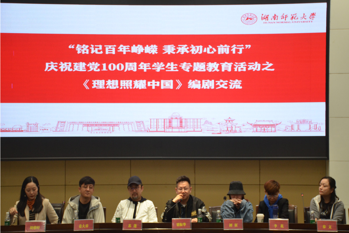 《理想照耀中国》作为国家广电总局、湖南省委宣传部指导的建党100周年献礼剧,以建党100周年来各个阶段的“中国精神”为坐标,展现了新时代全国人民为实现中华民族伟大复兴中国梦不懈奋斗的精神风貌。通过短片欣赏,同学们增进了对《理想照耀中国》内容的了解,加深了对主旋律作品创作及其呈现形式的认识。梁振华教授认为:“同学们要打开视野,注意到当下的审美变化状况,重视对话和批评,注重对作品文本的鲜活感受。”以《理想照耀中国》为例,他谈到主旋律作品的创作原则,分析其中包含的真实人物的戏剧化。同时他表示期待与现场同学的交流和对话。