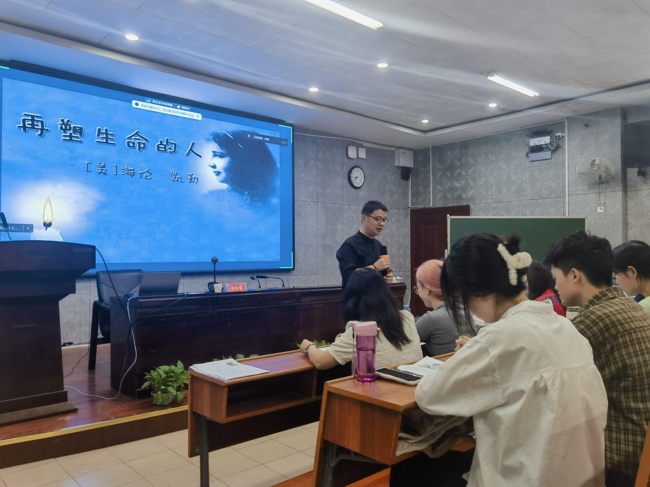 肖老师引领着二十位本科生,先上了一堂《再塑生命的人》的示范课。通过抓标题、首尾段、关键句,肖老师带着学生以读促悟,从字里行间去感受文本之妙。这堂示范课充分体现了他对于朴素、艺术的语文课的坚守,唤起了师范生对于语文教师职业的认知和认同。
