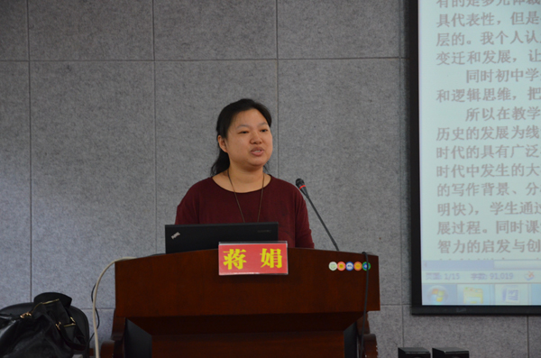 蒋娟首先与在座学员分享自己的教学心得。她指出对于诗歌的课堂教学,教师可以以史为纲,借助课内必修诗歌,补充课外背诵的诗歌,带领学生走进诗歌的殿堂——唐朝。接着,蒋娟开始系统地赏析唐诗。她将唐朝分为初唐、盛唐、中唐、晚唐四个阶段。蒋娟从诗歌作品着手,对每个阶段出现的代表诗人、作品风格以及对后世的影响等方面进行详细解读,同时穿插作品的时代背景,将诗歌与所处时代联系起来。着重指出在教学过程中,诗歌作品可以举一反三,将相似题材的诗歌对比起来教学,这可以发散学生思维,触类旁通。