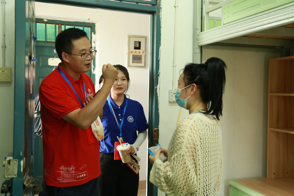 刘宓蜜对新生的到来表示欢迎,每到一间宿舍,她都详细询问新生报到情况,还认真查看了宿舍环境及内部设施。“你来自哪里?”“是不是第一次在学校住宿?”“来到这里适不适应?”“大学生活即将开始,有没有做好准备?”周紫阳则叮嘱新生认真做好规划,珍惜大学时光,在今后的学习中互帮互助,团结进取。对于学习生活中遇到的困难,要及时和辅导员、助理辅导员反映,辅导员及助理辅导员会积极帮助同学们解决问题。