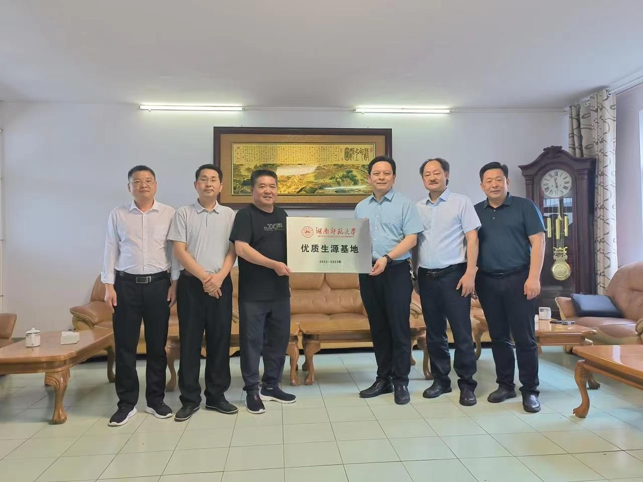 5月31日上午,在岳阳县一中接待室举行了简单隆重的授牌仪式,李伶俐、徐朝红隆重将“伟德BV1946优秀生源”基地授予岳阳县一中党委书记陈灏和校长续鹏飞。陈书记和续校长分别报告了学校的办学历史和现状,仪式结束后,续校长陪同学院领导一行认真参观了岳阳县一中的校园。下午参观了岳阳县渔业公司和洞庭旅游公司,了解师大毕业生的表现情况,听取了对学生培养和就业的需求和建议。晚上看望了校友代表——岳阳市人大副主任田文静、岳阳县委书记肖湘晖等,校友们深情回顾了在学校生活的点点滴滴,蔡炳华、彭万福给校友送上公司开发的文旅纪念品。