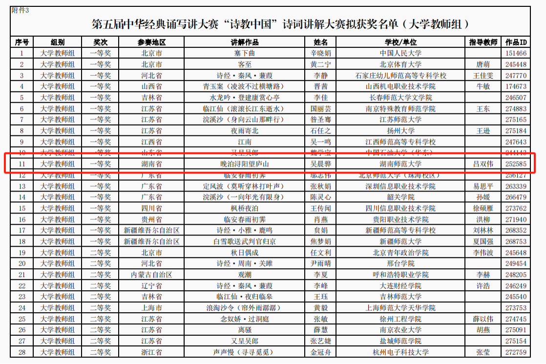 (教务办供稿)近日,第五届中华经典诵写讲大赛“迦陵杯•诗教中国”诗词讲解大赛公布获奖名单,我院教师吴晨骅在吕双伟副院长的指导下参赛,并以其讲解作品《晚泊浔阳望庐山》获全国大学教师组一等奖。