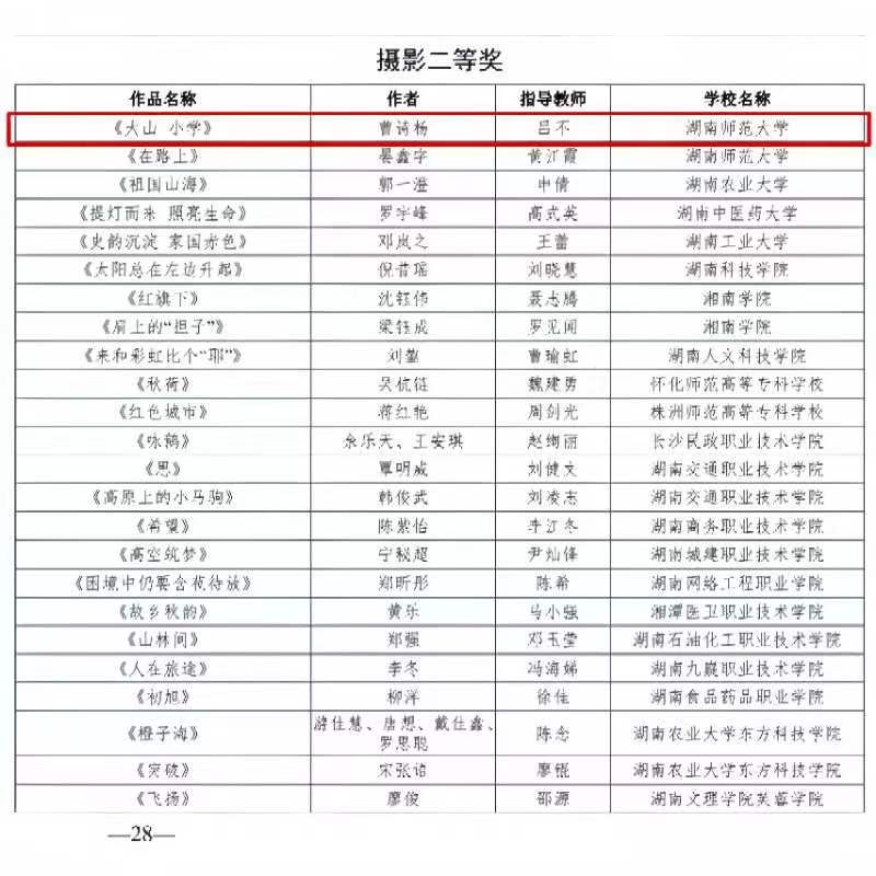 (通讯员谢璐怡)近日,湖南省教育厅发布《关于公布全省第七届大学生艺术展演活动评选结果的通知》,1946伟德国际源自英国共获奖3项。摄影类作品《大山 小学》获二等奖,设计类作品《新青年》获得二等奖,朗诵艺术节目《永远二十二岁》获得二等奖。