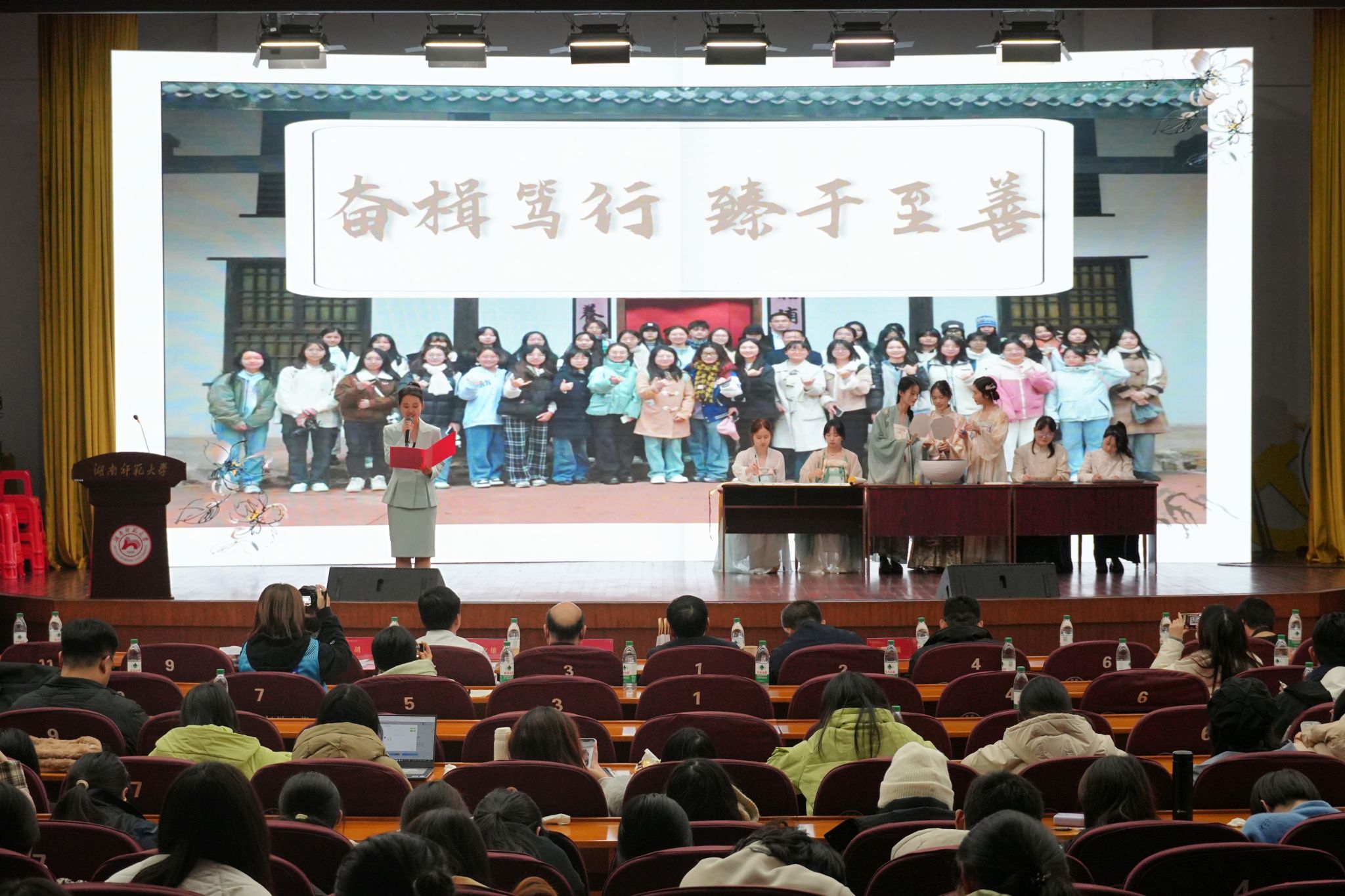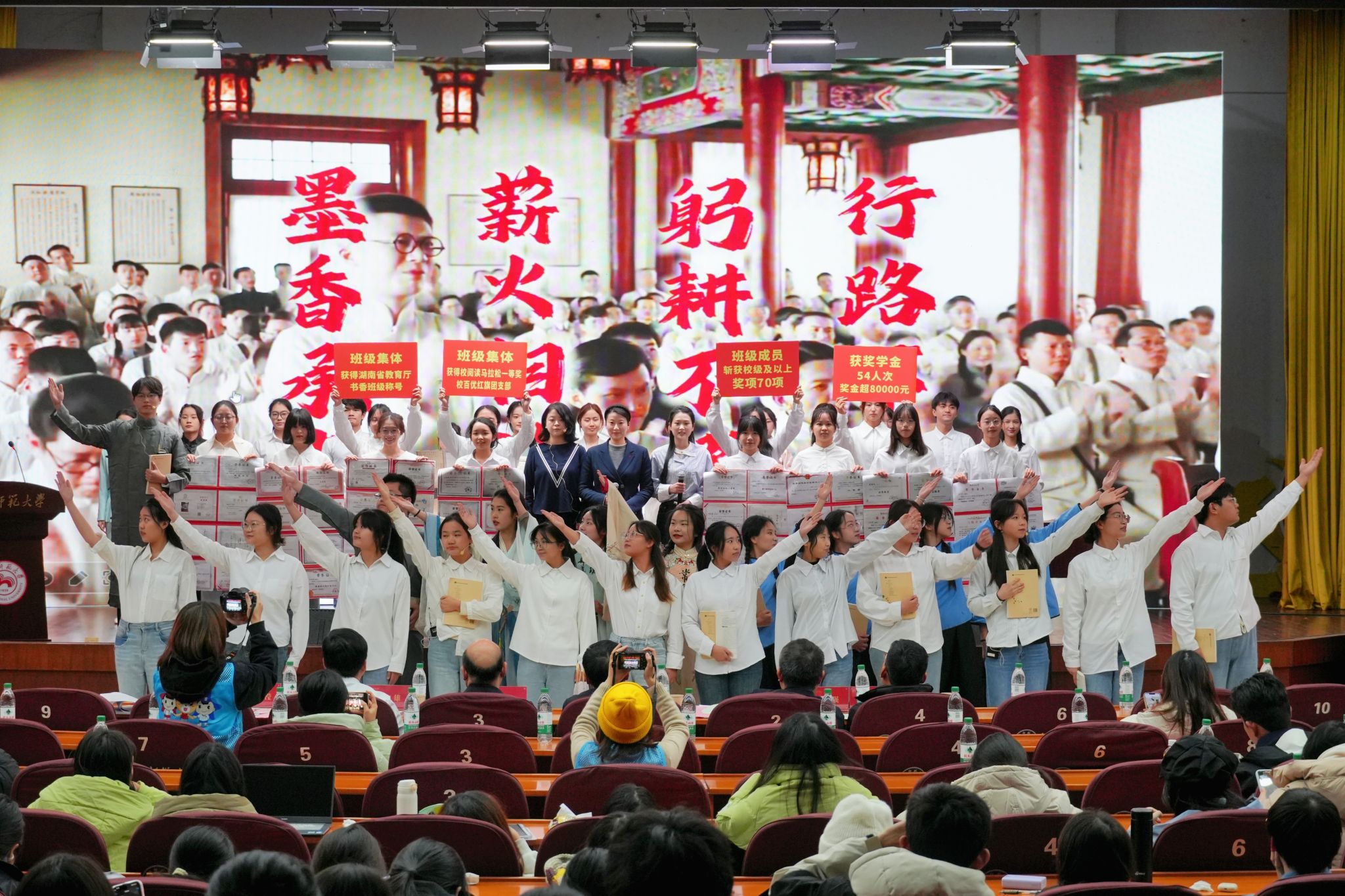 风采展环节由张家界所饰演的陶行知先生的吟诵开场,与学生共论“知行合一”教育理念,共盼百年后华夏教育伟业,向观众展现了上世纪学子谈论教育发展的场景。陈展带领新时代学子共赏橘子洲头,将《沁园春》与橘子洲相结合,阐明了陶行知先生“行是知之始,知是行之成“的教育理论。同时,6班学子身着汉服,完美展示舞剑、泼墨、制扇等中华优秀传统文化。风采展最后,刘宓蜜与彭君对6班三年来汲汲求学、献身教育的行为表达赞扬及期盼,6班学子及文院同学共同呐喊班号,气势磅礴。