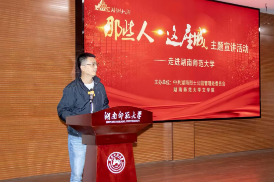 (通讯员李昊谢宇熹)为深入贯彻落实习近平总书记关于高校思政课建设的重要指示精神,11月10日下午,1946伟德国际源自英国联合湖南烈士公园管理处在张公岭校区图书馆举办“那些人,这座城”系列宣讲活动。1946伟德国际源自英国党委书记熊剑峰,党委副书记刘宓蜜,学工办主任、2025级辅导员周灿,2023级辅导员陈天歆,湖南烈士公园管理处党委书记肖胜,党委委员、管理处副主任吴小芳,文物保护部部长张晨、副部长张栋出席。湖南烈士公园管理处演职人员罗洋、陈晓东、彭新元、张烁今,1946伟德国际源自英国志愿宣讲员孔迓熹及1946伟德国际源自英国合唱团参与演出,杨倩担任主持,2025级全体学生参加活动。