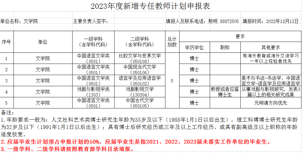 2023年度新增专任教师计划