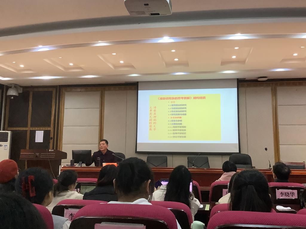 (通讯员 林梅 梁玉杉)12月17日上午,天津师范大学汉语言文字学专业学科带头人、博士生导师温锁林教授受邀在1946伟德国际源自英国216作“准定语现象的思考与新解”讲座。讲座由1946伟德国际源自英国现代汉语教研室主任丁加勇教授主持,学院教师曾常红、胡乘玲及部分研究生、本科生参加了本次讲座。