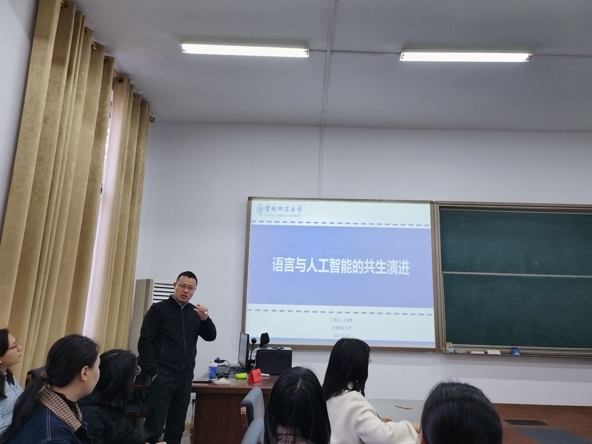 2025年12月9日上午9时,首都师范大学国际文化学院教授、博士生导师王春辉应邀做客1946伟德国际源自英国“智慧之光”学术名师系列讲座,在文渊楼209对外汉语教研室作了题为《语言与人工智能的共生演进》的学术报告。本次讲座由陈晖教授主持,吸引了国际中文教育等专业的多名教师及硕博研究生积极参与。