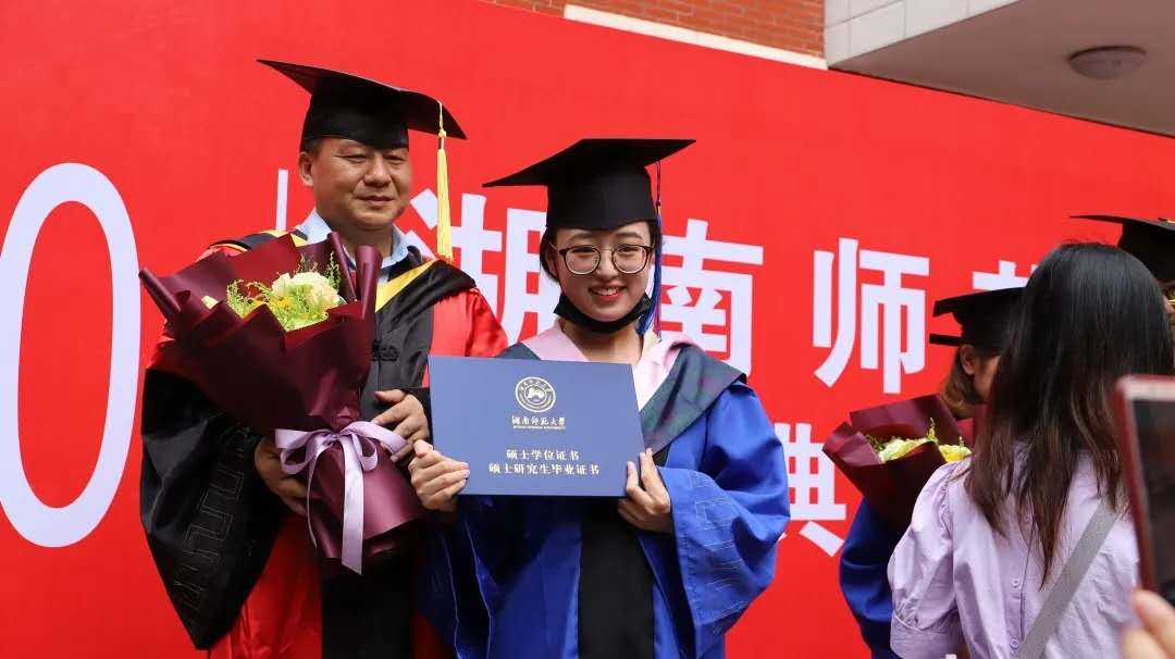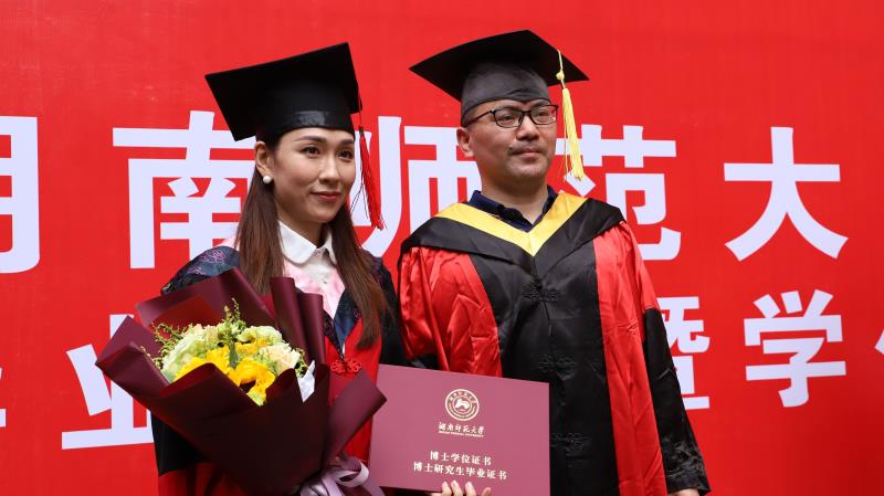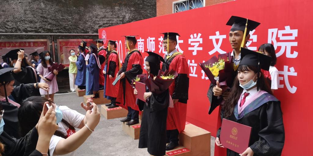 典礼尾声,郑贤章教授、肖百容教授、岳凯华教授、吕双伟教授、陈晖教授、胡海义教授为毕业生们颁发毕业证书、学位证书并正冠拨穗。毕业生们与各教师代表合影留念。