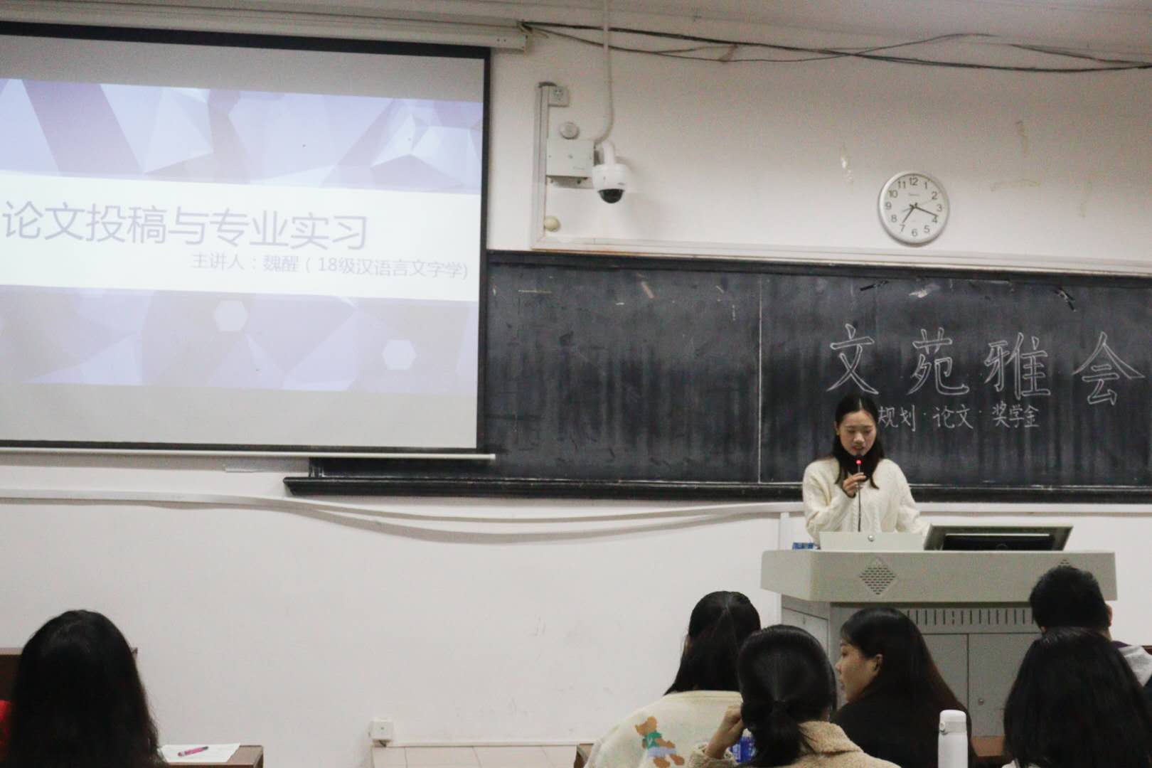 (通讯员郭帆)10月21日晚7点,1946伟德国际源自英国研究生学生会在1946伟德国际源自英国317举办了第二届“文苑雅会”学术沙龙活动。本次沙龙围绕“规划•论文•奖学金”主题展开,主讲人分别是18级写作学专业聂文涛、18级当代文学专业李岳峰、18级汉语言文字学专业魏醒以及19级现代文学专业申晓。本次沙龙由学术部郑明月主持。