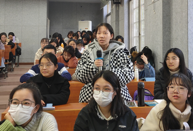 张瑞芳分享了自己的校园时光和人生经验。她提出四个问题:“你有怎样的人生规划?你的职业期待是什么?你目前有怎样的困惑?你希望我们今天聊什么?”同学们思考并进行了回答。在解答过程中,她提出,要重视对学生的品德教育,并由此引入讲座主题。张瑞芳从第一次教育实习、第一次当班主任、第一次公开课以及现在的我四个方面展开分享,列举自己在教学经历中的具体事例,向同学们陈述自己的观点及教学理念。她总结出自己在教学过程中的四点变化:一是理念变化,教育过程中,教师、学生、家长三方是缺一不可的;二是行为变化,在与学生的沟通交流中,通过观察学生,调整相应的教育教学方法;三是包容度提升,用发展的眼光看待学生,给学生改变、发展的时间,对待学生要包容;四是处理问题的从容性提高,每个学生都有其独特性,要分析每个学生的特点,深入学生的内心世界。