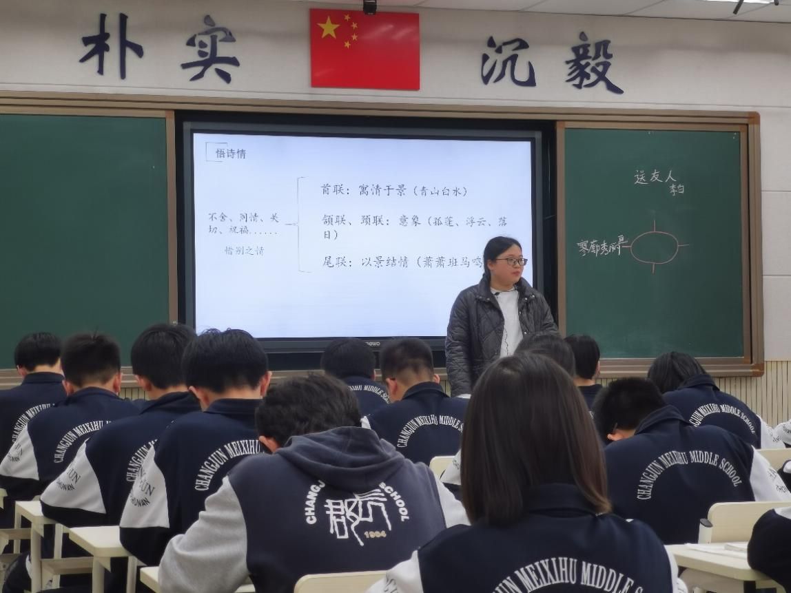 马德润执教的篇目为李白的诗歌《送友人》。她用全国各地方言诵读李白的诗篇视频资料导入,然后从意象入手,带领学生通过朗读的方式体会诗歌所蕴含的思想情感,知悟李白送别诗用借景抒情的手法,体现一种“感而不伤”的风格。再对诗歌的押韵、节奏、句式加以分析,归纳出李白这首律诗的不拘俗套。从内容到形式两个层面提炼了整首诗 “‘别’有新意”的特色。在此基础上,再以课堂练习的形式,让学生比较李白的《金陵酒肆留别》一诗,加强对唐诗的学习与鉴赏。