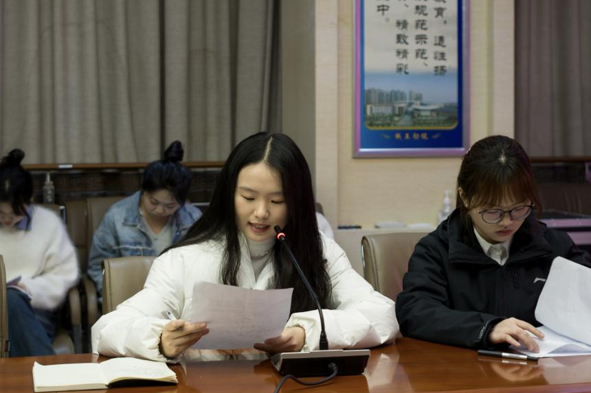 实习队长范茗萱在发言中感谢院领导及实习学校各位领导、老师的帮助,同时承诺实习队员会坚持“四有”原则,即有思想、有计划、有落实,认真对待实习工作,实现自我成长。最后,实习队副队长王佳露总结汇报本队教育实习前期准备工作。