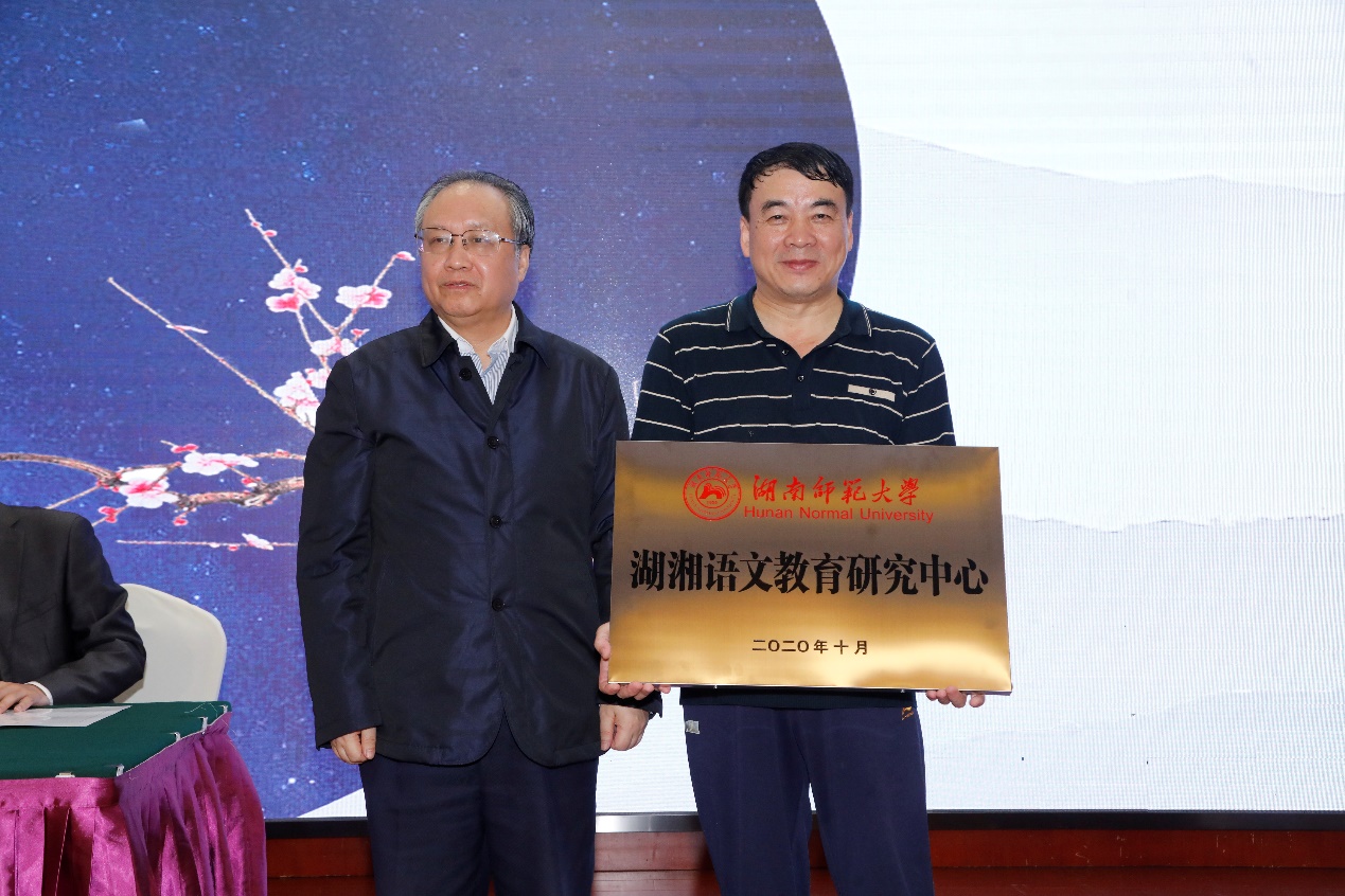 2020年10月,中心举行成立大会暨首届湖湘语文学术论坛,图为伟德BV1946欧阳副校长给中心授牌