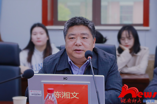 陈湘文代表省社科规划办感谢各位专家前来指导湖南省社科工作,他充分肯定了我校在国家社科基金项目方面取得的优异成绩。他希望各位专家公平公正开展结题鉴定,发现项目研究的创新价值、推广价值和改进之处,推动项目组深化研究,实现新突破。