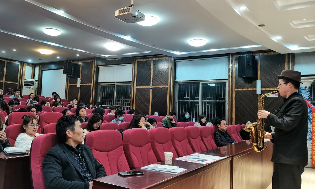 曾凡忠博士从“走出瑶山”“自学成材”“艰苦创业”“回报社会”“醉心文艺”5个方面分享了自己的求学经历,展示了多方面的才艺及取得的成绩,鼓励同学们挖掘自己的兴趣,充实自己的生活。曾凡忠通过视频展现了自己到处拜师学会20多种乐器的音乐天赋,现场演奏了筚篥、萨克斯等乐器。他还在现场展示了具有创新特色的人像剪纸、钢笔画、女书篆刻、书法等艺术作品。他提出剪纸和蜡染结合,篆刻和陶瓷结合等艺术产品创新,并且获得专利。