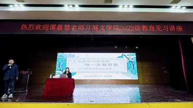 (通讯员黄迎迎 王金国 陈晓岚)3月6日下午,1946伟德国际源自英国2022级汉语言文学(师范)专业教育见习讲座于江边活动中心举办。谭嘉慧应邀作讲座,中文系副主任刘光成主持,2022级汉语言文学(师范)专业全体学生参加此次会议。谭嘉慧是长沙市怡海中学语文名师工作室首席名师、湖南省“教学能手”、长沙市“卓越教师”、长沙市天心区教育领军人才、清华大学出版社签约作者。谭嘉慧用智慧和汗水浇灌了教育的沃土,让一朵朵智慧之花在各领域绚丽绽放。