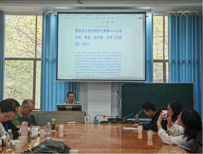 在选题策略与研究方法上,沈教授系统阐述了几点主张。其一,重视点线面结合的研究路径。他回顾了自己从韦应物古诗艺术研究入手,延伸至欧阳修、苏轼,再聚焦历代石鼓文诗歌,最终提炼出“考古诗”这一类型概念的学术历程。他强调,一首诗、一类诗均可成为持续深入的研究生长点,青年学者应将硕士、博士论文做深做透。其二,学会从材料中提炼准确的学术概念。沈教授认为,纯粹文学研究发表不易,研究者须在对文本具备深度感知与审美能力的基础上,从资料排比与分类中凝炼出具有概括力的新范畴,“考古诗”“诗学考古”等提法即是将文学研究与文化命题相结合的尝试。其三,高度重视文献基础。 他提醒研究者,撰写一篇硕士论文至少需阅读百万字直接相关的资料,即使是运用AI辅助,也须建立在扎实的既有积累之上。