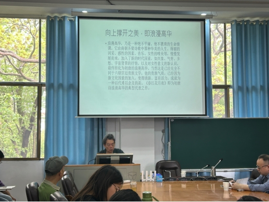 胡教授首先指出,当下全社会对诗词的兴趣日益高涨,但亟需系统的理论支撑。我们正处于传统中国向现代中国转型的关键时期,古典文学研究并非要回归复古,而是要在坚守自身文化传统的基础上实现发展,古典中国本就是现代中国不可或缺的组成部分。随后,胡教授从“心灵诗学”的定义出发,解释了为何选用“心灵诗学”而非“言志诗学”与“言情诗学”,因为“心灵”是更具包容性的词语。胡教授通过与西方相近概念的比较与界定,指出“文化心灵”难以翻译,义涵深厚,深具阐释价值。在此基础上提出“心灵诗学”的三层定义,这三层定义共同构成了一套学艺兼修、古今贯通的整体诗学。一是民族的文化心灵与集体记忆。他具体阐述中国古典诗歌在古代是如何塑造了中国人的人格精神、集体记忆,以及“士志于道”的超越性追求。二是古人的高妙心志与隐含心曲。他以司马相如“苞括宇宙”的宏阔心志与苏轼的澄明观照万物的禅意境界等为例,提出古典诗歌是个体生命体验与精神超越的心灵载体。三是当代的感发兴寄与诗心传承。胡教授先从自身有感而发创作的诗歌谈起,再着重通过《春江花月夜》的例子,阐释“心灵诗学”如何实现古今心灵的对话。《春江花月夜》中对“无限”的追求和对宇宙的体认依然能唤醒当代人的共鸣。